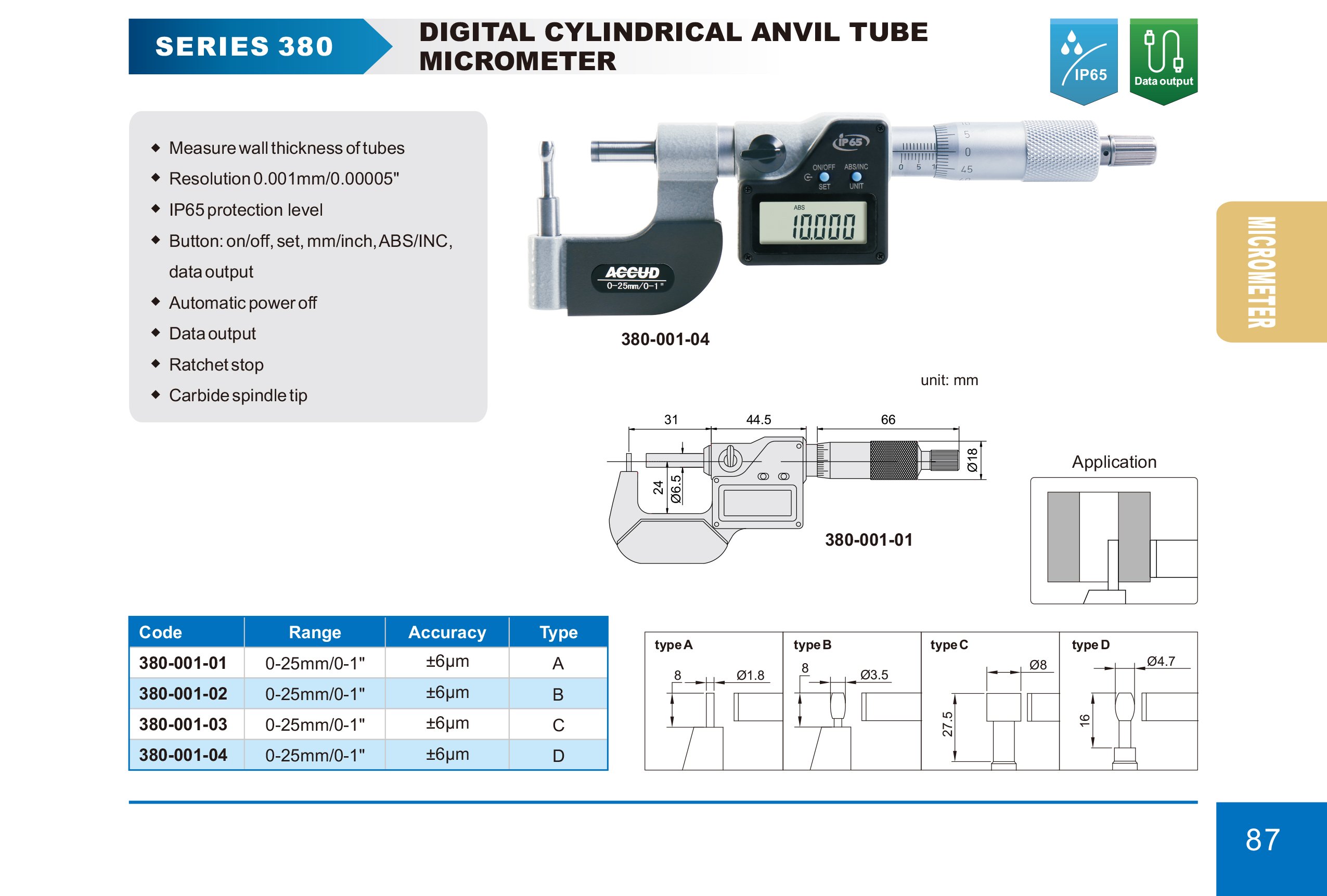 ACCUD 380-001-04 digitální mikrometr s válcovou měřicí plochou, 0-25mm/0-1" ANVIL TUBE 16xΦ4.7mm IP65 (0.001mm/0.00005")