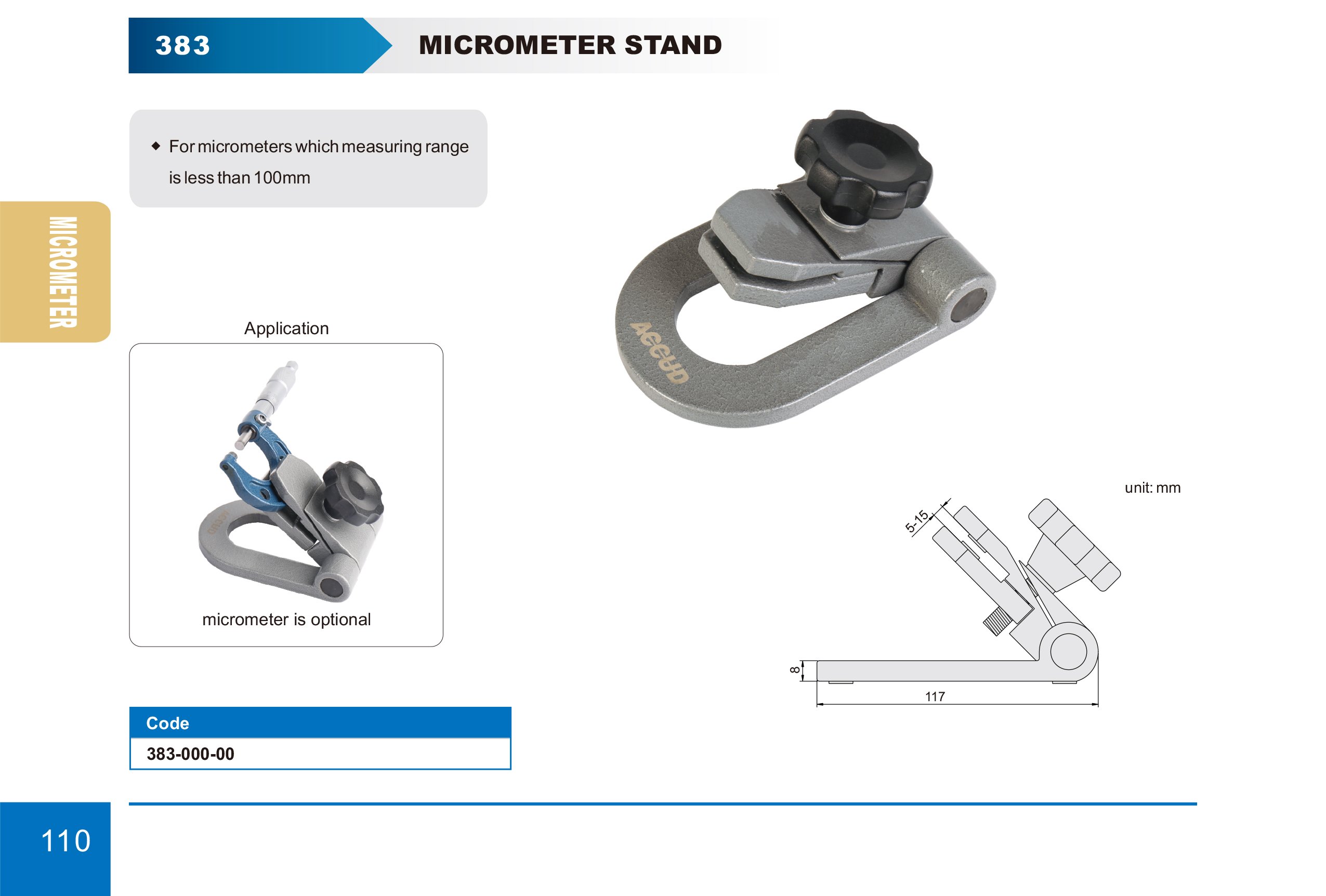 Nastavitelný stojánek pro mikrometrická měřidla jako jsou vnější i vnitřní mikrometry, dvoudotekové i třídotekové dutinoměry. Pro mikrometry s rozsahem měření menší než 100 mm.