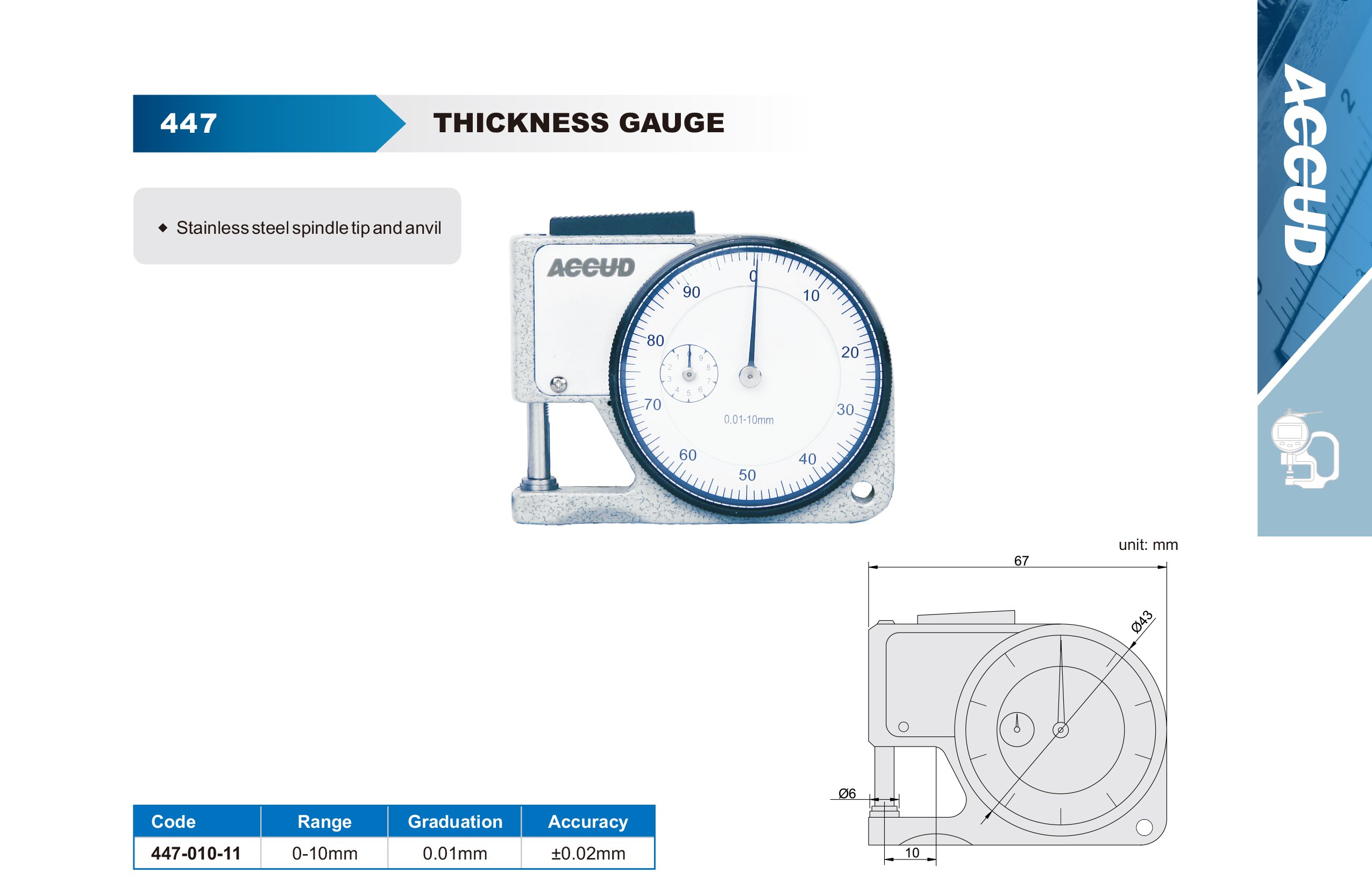 ACCUD 447-010-11 číselníkový tloušťkoměr 0-10mm ( 0.01mm )
