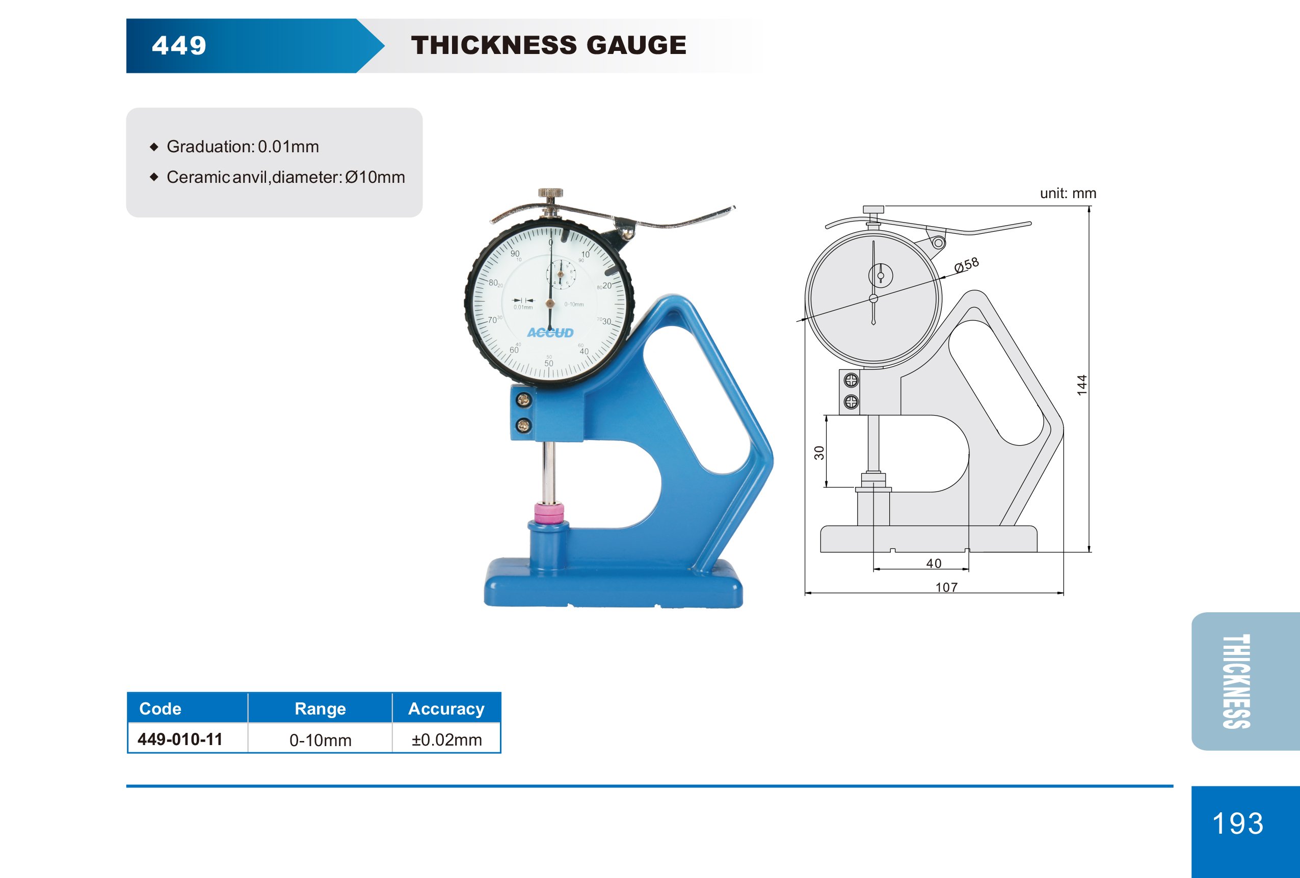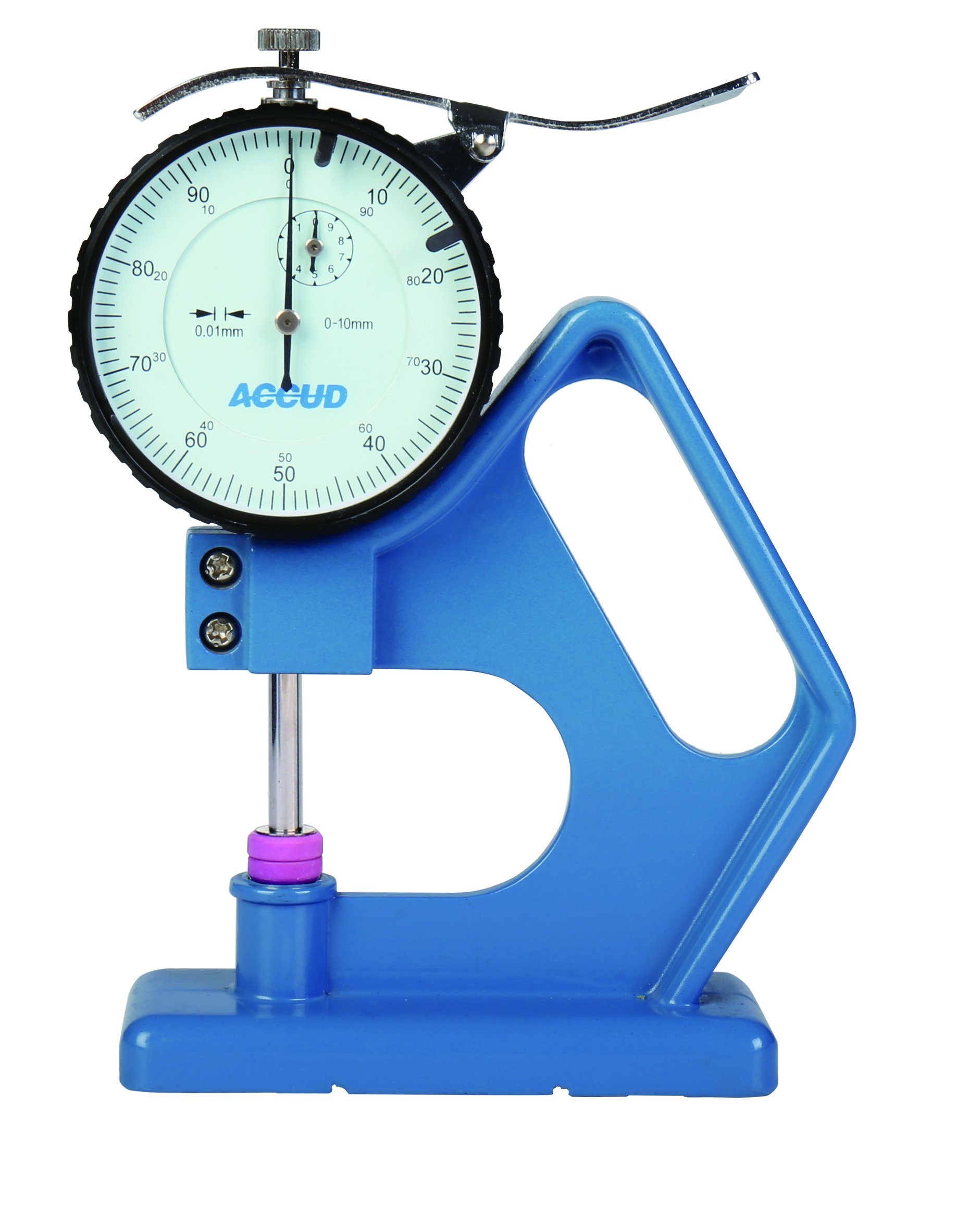 ACCUD 449-010-11 číselníkový tloušťkoměr se základnou, ploché doteky 0-10mm ( 0.02mm )
