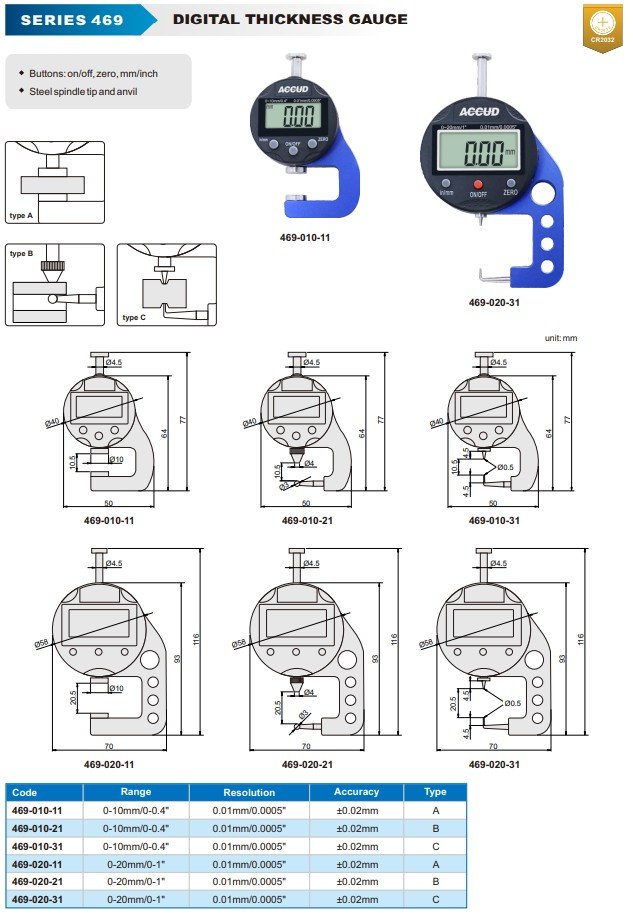 ACCUD 469-010-21 digitální tloušťkoměr, 0-10mm/0-0.4", typ B