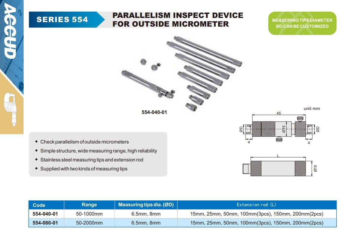 Přípravek pro kontrolu paralelismu vnějších mikrometrů s jednoduchou konstrukcí, širokým měřicím rozsahem a vysokou spolehlivostí. Je vybaven nerezovými měřicími hroty a prodlužovacími tyčemi a je dodáván se dvěma typy měřicích hrotů.