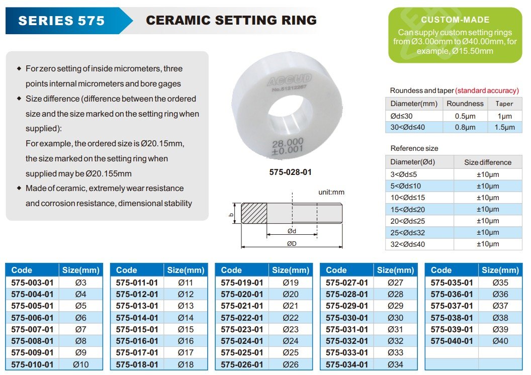 Keramický nastavovací kroužek slouží k přesnému nulovému nastavení dutinoměrů a tříbodových vnitřních mikrometrů. Vyniká vysokou odolností proti opotřebení a korozi a zajišťuje dlouhodobou rozměrovou stabilitu pro přesná měření.