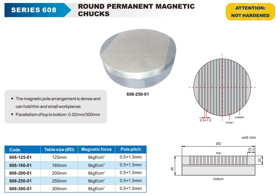 Kompaktní kruhový magnetický stůl s hustým rozložením pólů zajišťuje spolehlivé upnutí i tenkých a malých obrobků při obrábění i kontrole.