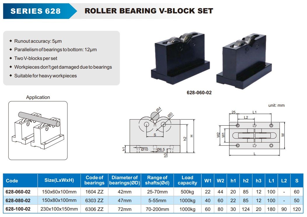 Sada V-bloků s válečkovými ložisky určená pro přesné a bezpečné upnutí obrobků. Díky ložiskům nedochází k poškození obrobků a konstrukce je vhodná i pro těžké díly; sada obsahuje dva V-bloky.