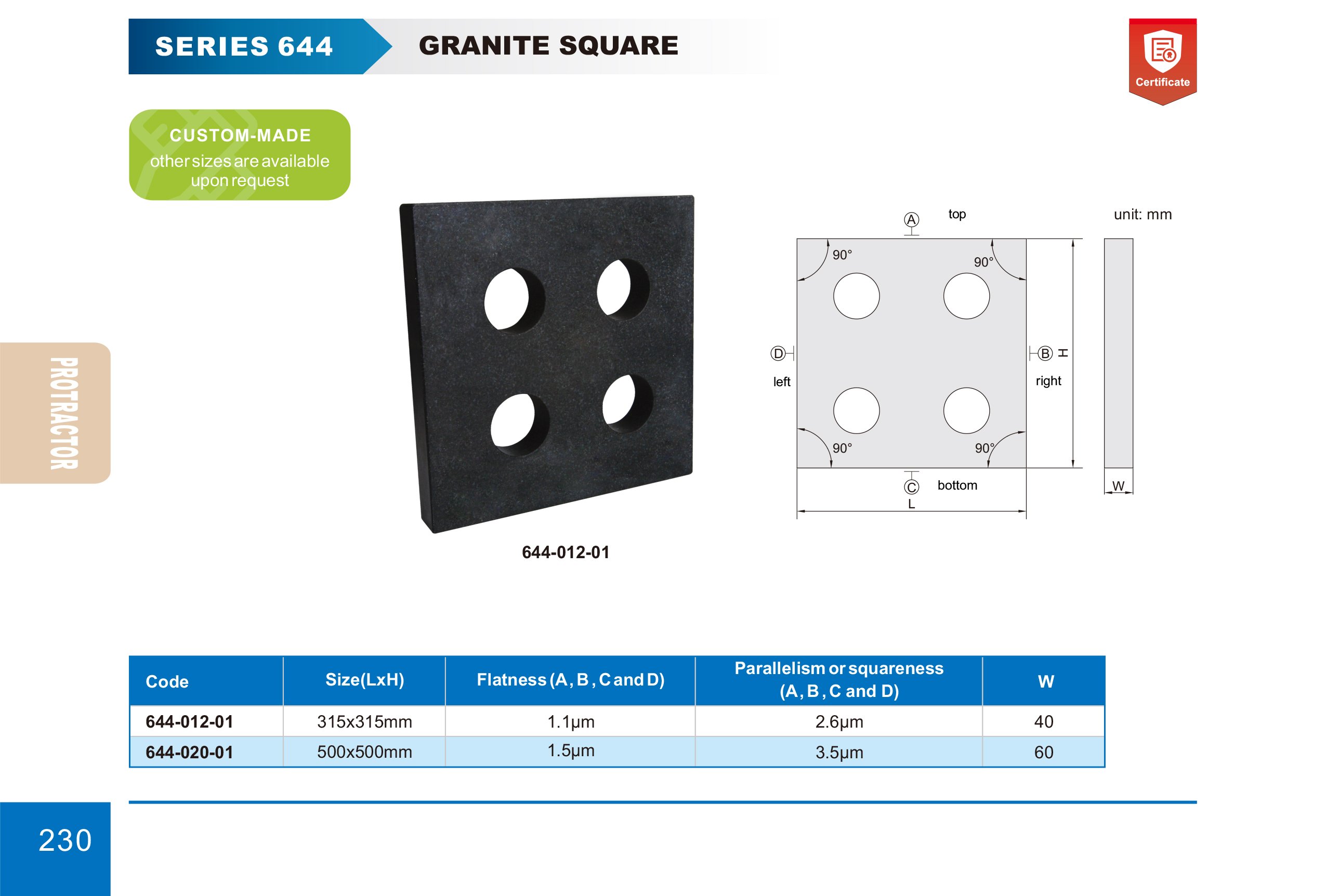 Granitový čtverec Technická specifikace: Velikost: 500x500mm Rovinnost stran: 1,5µm Rovnoběžnost stran a odchylka úhlů: 3,5µm Rozměry: Další informace o produktu naleznete v níže přiloženém datovém listu ve… Více
