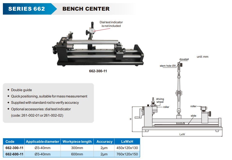 Stolní měřicí přípravek s dvojitým vedením, který umožňuje rychlé nastavení a je vhodný pro sériové měření. Dodává se se standardním etalonovým trnem pro ověření přesnosti.