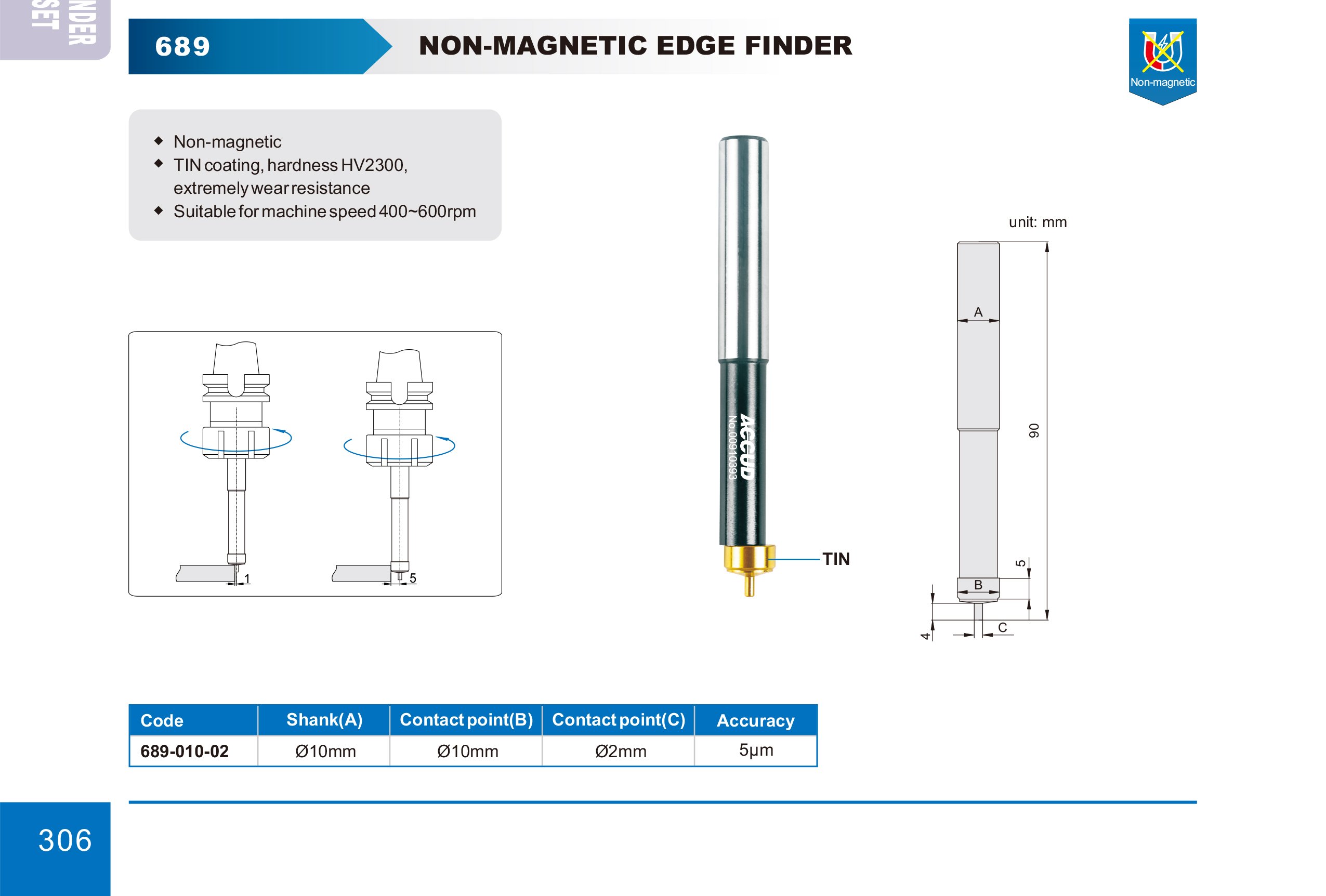 Mechanický najížděcí trn Technická specifikace: Dřík: Ø10mm Kontaktní bod (B): Ø10mm Kontaktní bod (C): Ø2mm Přesnost: 5µm Nemagnetický Povlak TIN, tvrdost HV2300, extrémně odoln… Více