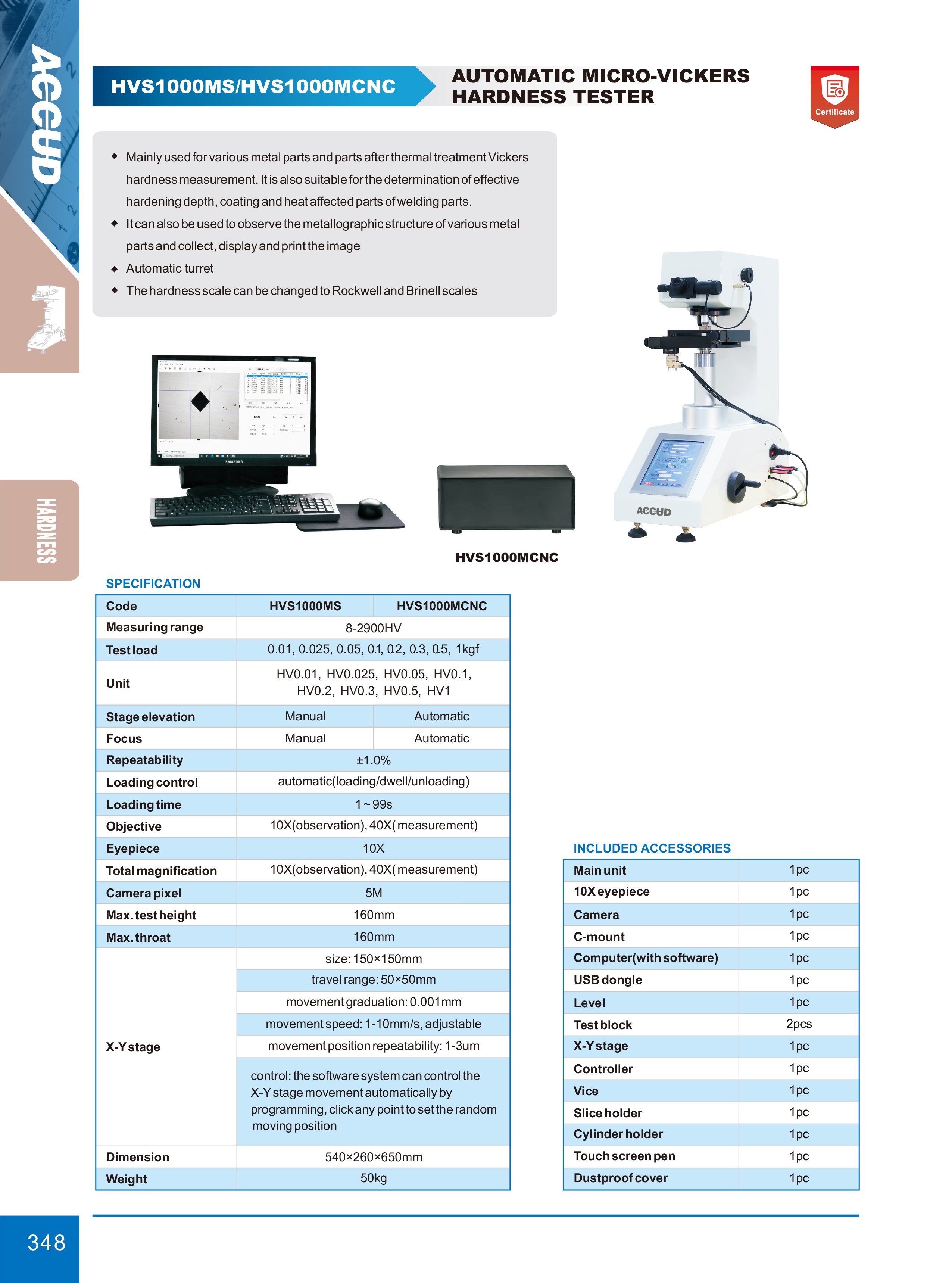 Plně automatický tvrdoměr, který se používá hlavně pro různé kovové díly a díly pro tepelné zpracování. Je také vhodný pro stanovení efektivní hloubky kalení, povlakování a tepelně ovlivněných částí svařovaných dílů. Lze také použít k pozorování metalografické struktury různých kovových částí a shromažďování, zobrazování a tisku obrazu. Stupnici tvrdosti lze změnit na stupnici Rockwell a Brinell.