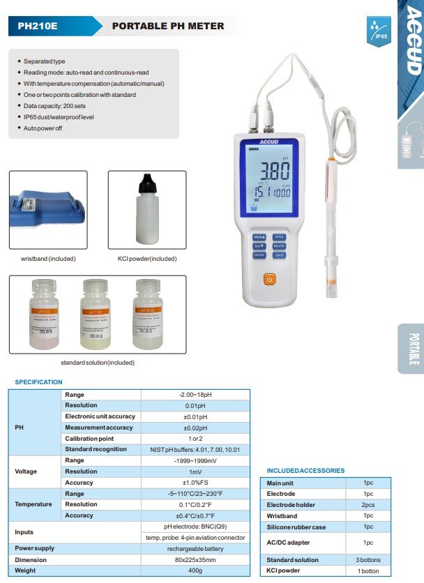 - PH: rozsah: 2.00~18pH, rozlišení: 0.01pΗ, přesnost elektronické jednotky: ±0.01pΗ, přesnost měření: ±0.02pΗ, kalibrační bod: 1 nebo 2, standardní rozpoznávání: NISTpH, vyrovnávací paměti: 4.01, 7.00, 10.01