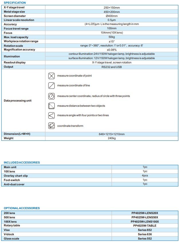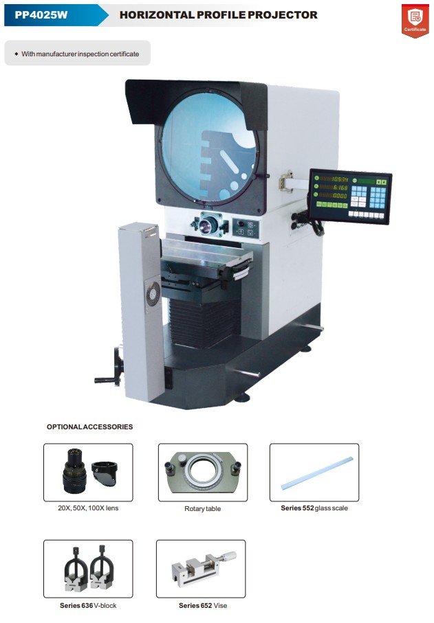 Projektor s horizontálním měřením Technická specifikace: X-Y podstavec: 250×150mm Velikost kovového podstavce: 450×200mm Průměr obrazovky: Ø400mm Lineární rozlišení stupnice: 0.5µm Přesnost: … Více