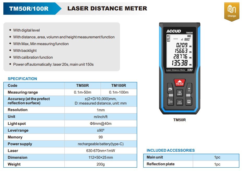 Tento přístroj je vybaven digitální vodováhou a umožňuje měření vzdálenosti, plochy, objemu a výšky. Podporuje funkci Max/Min měření a disponuje podsvíceným displejem pro lepší čitelnost. Zařízení má také funkci kalibrace a pro úsporu energie se automaticky vypíná – laser po 20 sekundách, hlavní jednotka po 150 sekundách.