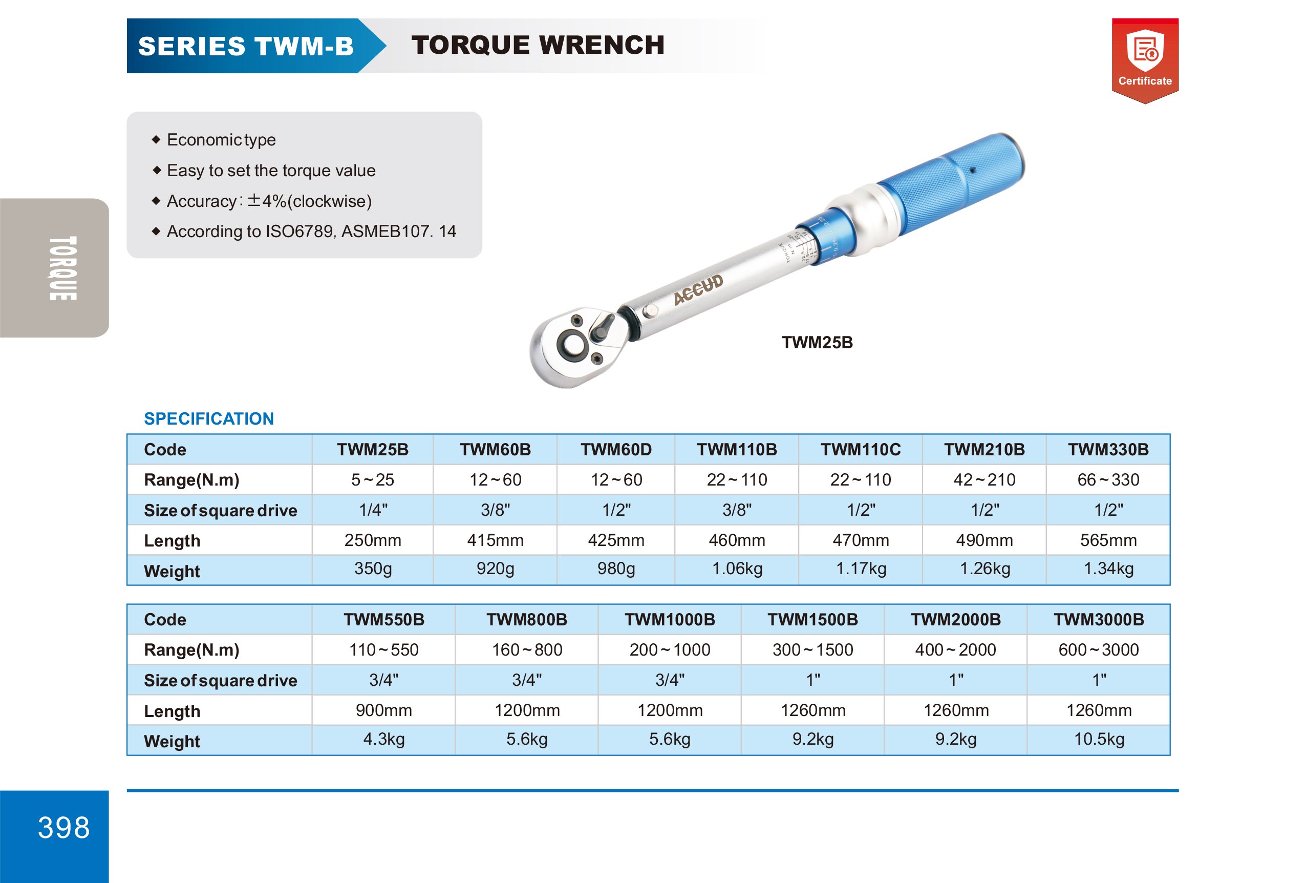 Ekonomický typ momentového klíče jednostranného se snadným nastavením hodnoty točivého momentu. Technická specifikace: Přesnost: ±4 % Podle ISO6789, ASMEB107.14 Rozsah: 12 ~ 60 Velikost čtvercového… Více