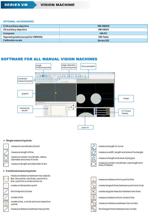 Profesionální stroj pro vizuální kontrolu s žulovým podstavcem a sloupem. Součástí je počítač a profesionální software (podstavec s ovládacím mechanismem je součástí dodávky pouze u modelu VM5040).