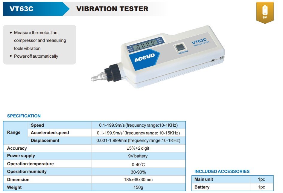 • Rozsah: rychlost: 0,1–199,9 m/s (frekvenční rozsah: 10–1 000 Hz), zrychlená rychlost: 0,1–199,9 m/s² (frekvenční rozsah: 10–15 000 Hz), posuv: 0,001–1,999 mm (frekvenční rozsah: 10–1 000 Hz)
