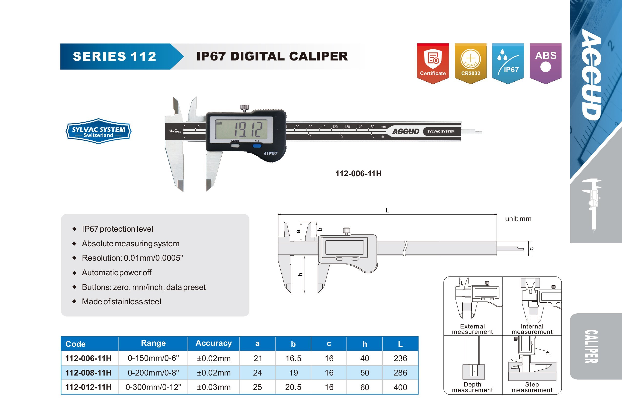 AKCE - ACCUD 112-012-11H digitální posuvné měřítko 300mm/12" voděodolné IP67 s elektronikou SYLVAC + ABS ( 0.01mm/0.0005" )