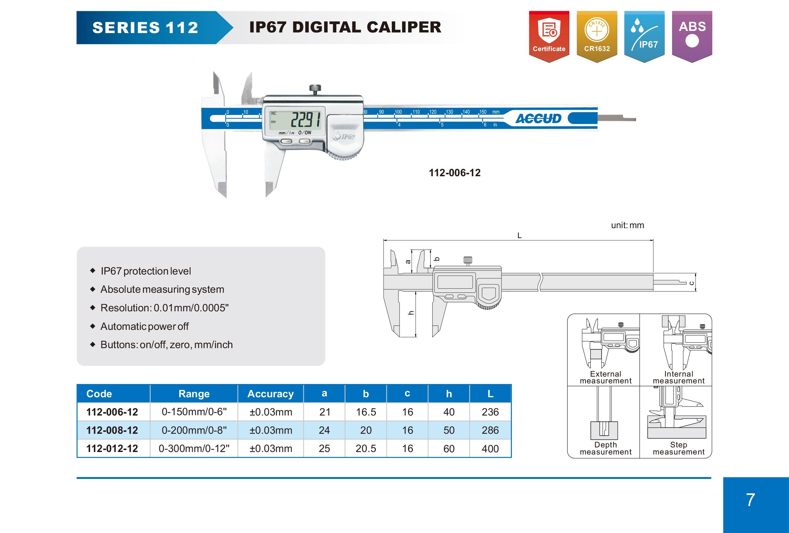 AKCE ACCUD 112-012-12 digitální posuvné měřítko 300mm/12" voděodolné IP67 ( 0.01mm/0.0005" )