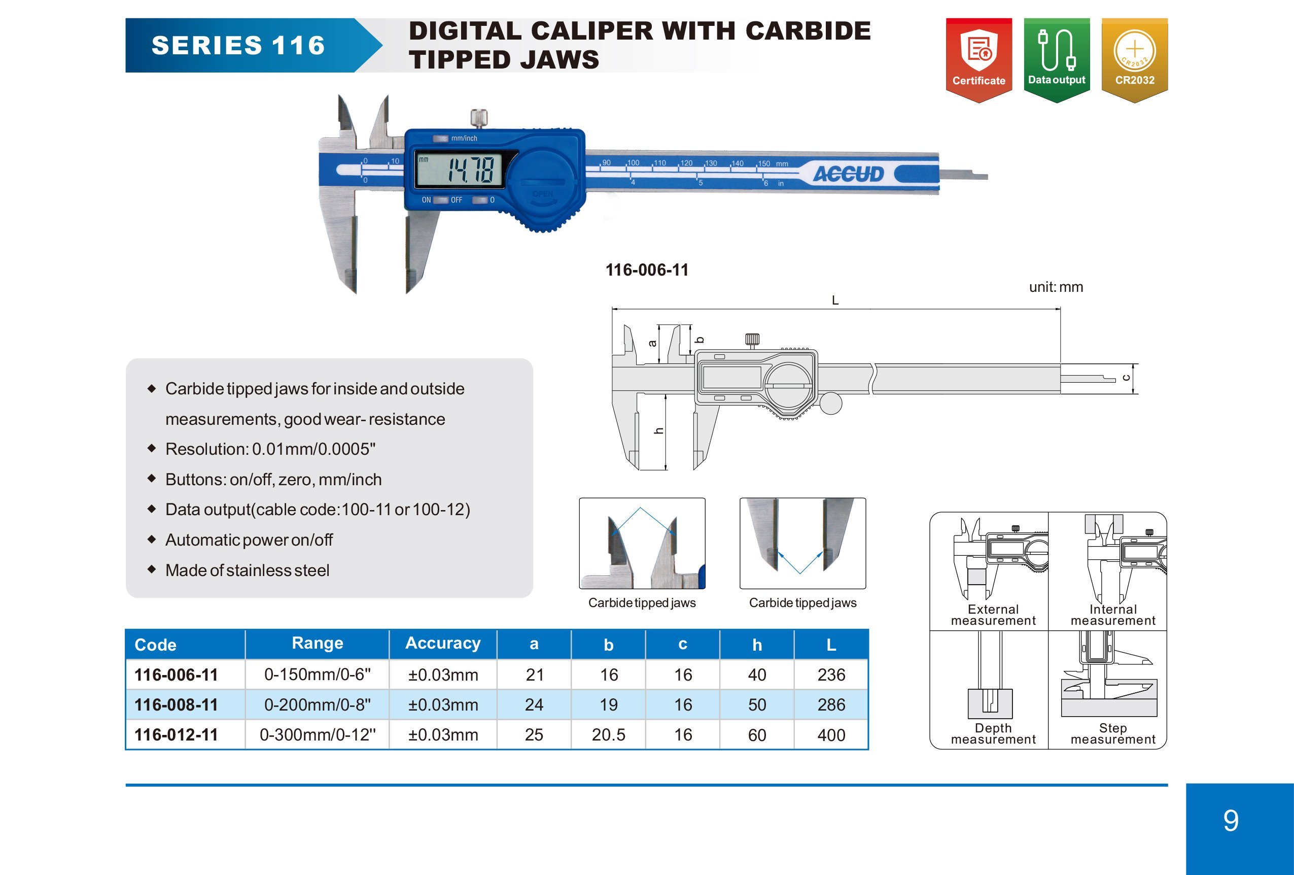 AKCE - ACCUD 116-008-11 digitální posuvné měřítko 200mm/8" s tvrdokovovými čelistmi ( 0.01mm/0.0005" )