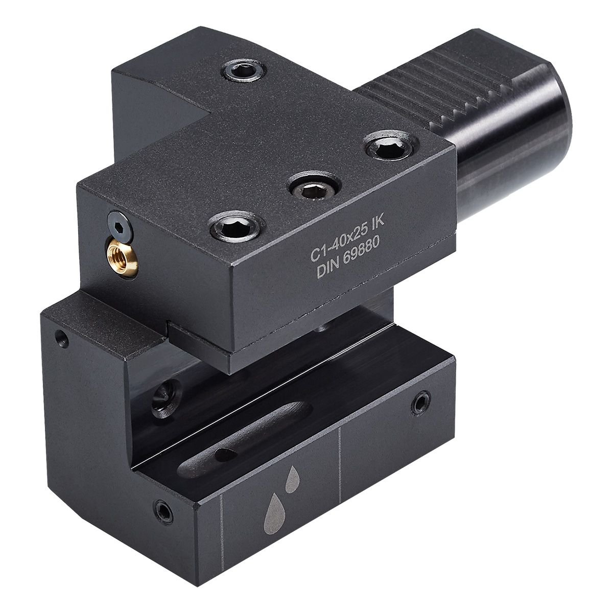 Axiální nástrojový držák v provedení C1, pravý, určený pro nástroje s vnitřním chlazením. Nabízí přesné přívodní chlazení, které zlepšuje odvod třísky, snižuje riziko jejího zaklínění a zvyšuje procesní bezpečnost i životnost nástroje. Je vhodný pro vnější i čelní obrábění a efektivně pracuje při nízkém i vysokém tlaku chladicí kapaliny.