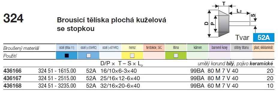 Brousící tělísko ploché kuželové se stopkou BRUSIVO 436168 /32451 3235.0015/ - T52 - 32/16x20-6x40 mm