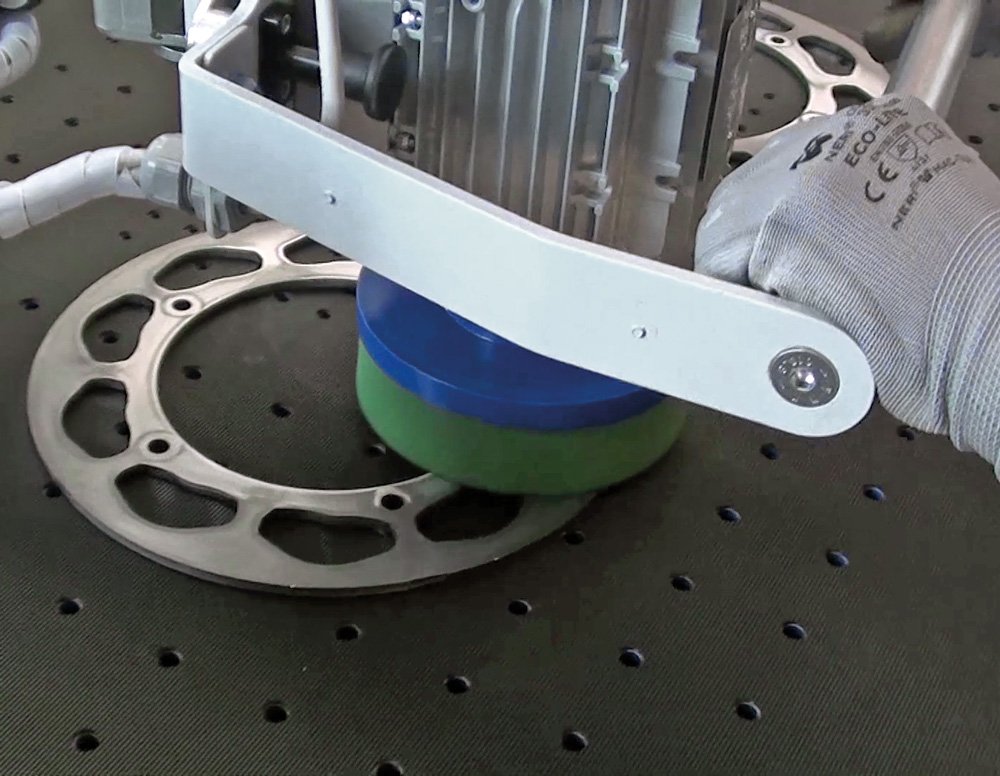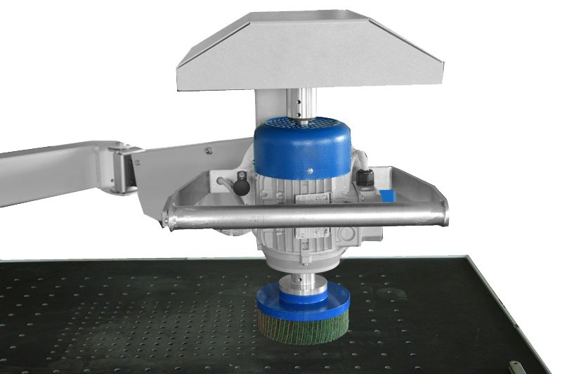 - Pracovní hlava vybavená dvěma nástroji, které lze během zpracování snadno vyměnit otočením hlavy o 180° (např. brusný kotouč a kartáč).