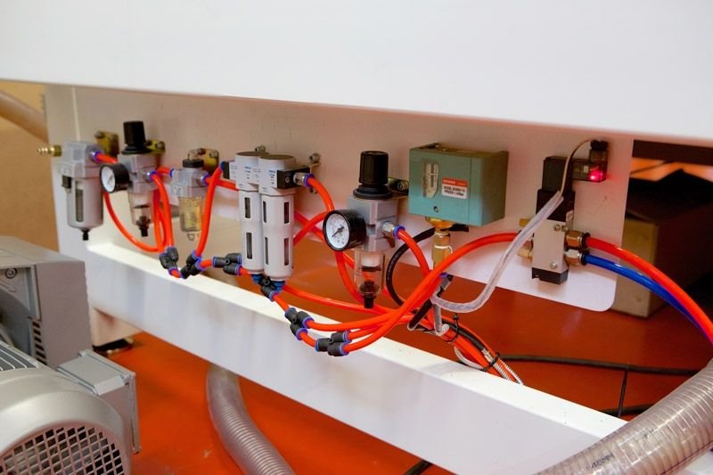 - Stůl: Plocha stolu je vyrobena z pryže, opatřená drážkami pro vedení podtlaku. Díky tomu se zpracovávaný materiál přichytne přímo ke stolu (bez použití upínek). Stůl je rovnoměrně rozdělen na několik segmentů, jež lze samostatně uzavřít. Zvýší se tak podtlak v pracovní části, kterou lze ještě vymezit těsnící gumou vloženou do drážky. Druhou možností upnutí materiálu je T-drážka, která slouží pro uchycení materiálu upínkami nebo připevnění různých přípravků.