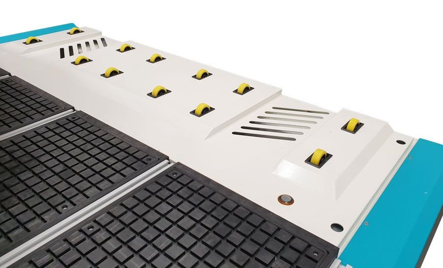 - Stůl: Plocha stolu je vyrobena z pryže, opatřená drážkami pro vedení podtlaku. Díky tomu se zpracovávaný materiál přichytne přímo ke stolu (bez použití upínek). Stůl je rovnoměrně rozdělen na několik segmentů, jež lze samostatně uzavřít. Zvýší se tak podtlak v pracovní části, kterou lze ještě vymezit těsnící gumou vloženou do drážky. Druhou možností upnutí materiálu je T-drážka, která slouží pro uchycení materiálu upínkami nebo připevnění různých přípravků.