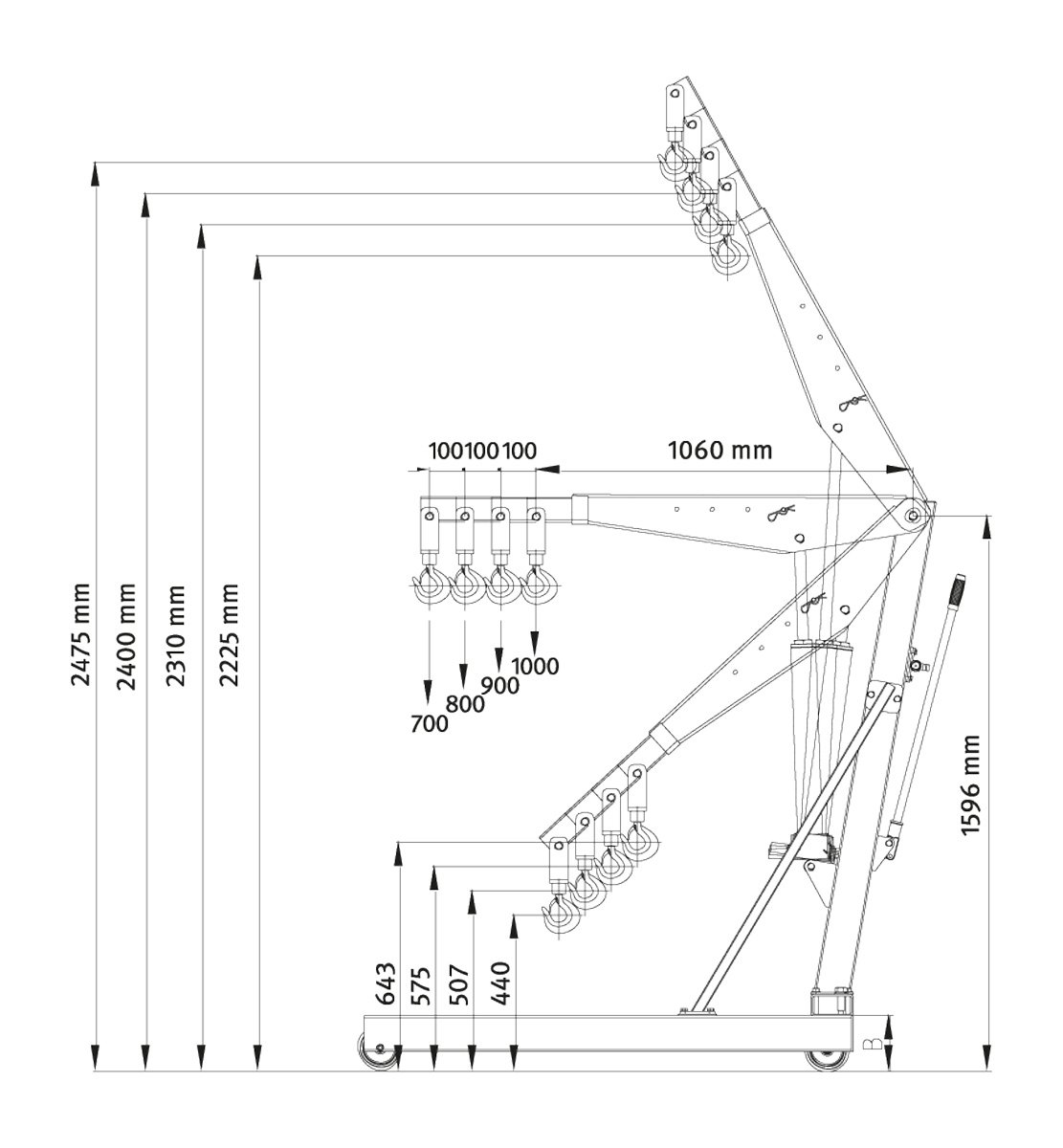 - Nosnost dle vyložení ramene - 0,7 t / 0,8 t / 0,9 t / 1 t