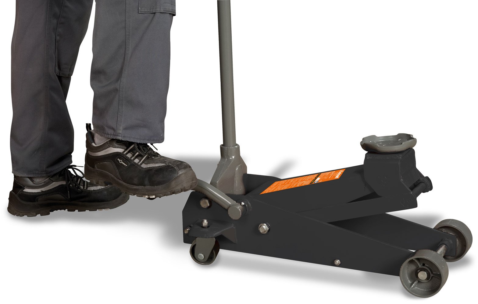 Nízkoprofilový pojízdný dílenský zvedák, ovládaný tyčí a nožním pedálem.