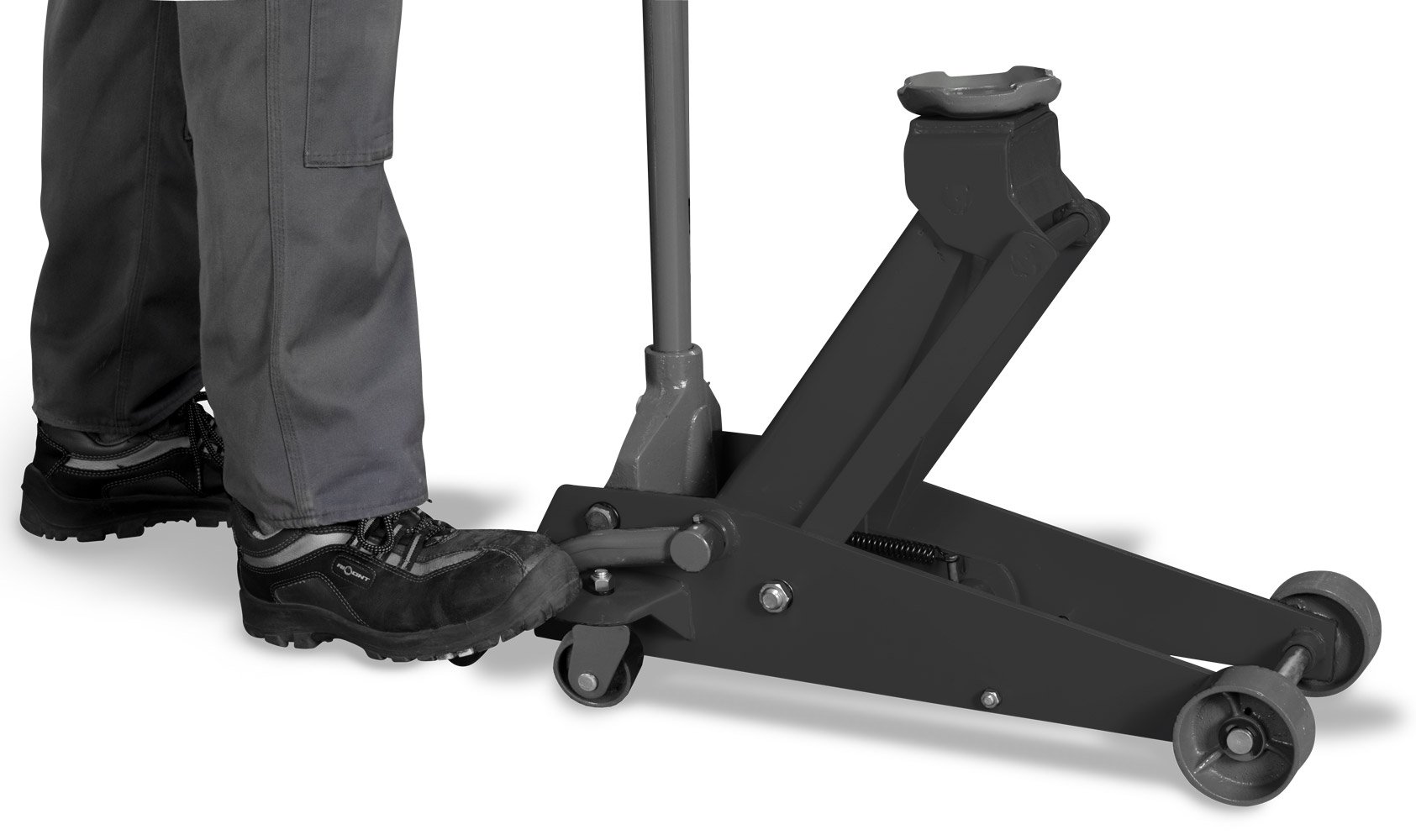 Nízkoprofilový pojízdný dílenský zvedák, ovládaný tyčí a nožním pedálem. Dvojdílná zvedací tyč s gumovým držadlemZvedání i spouštění vozidla se provádí zvedací tyčí a nožním pedálemČtyři litinová kolečka, dvě říditelnáVelký zvedací talíř Více