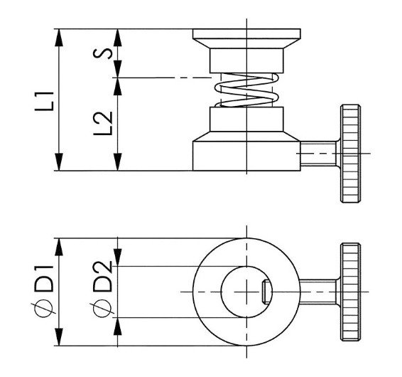Podpěra pružinové svorky s mosazným zajišťovacím šroubem. Pružinová podpěra svorky s mosazným aretačním šroubem. Technická specifikace: Velikost: 4 D1: 38 D2:22,5 L1: 40 L2: 28 Zdvih pružiny S: 12 Pro upí… Více