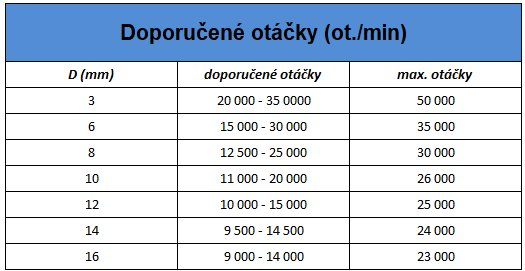 - Pro frézy menších rozměrů použijte vyšší otáčky dle doporučení