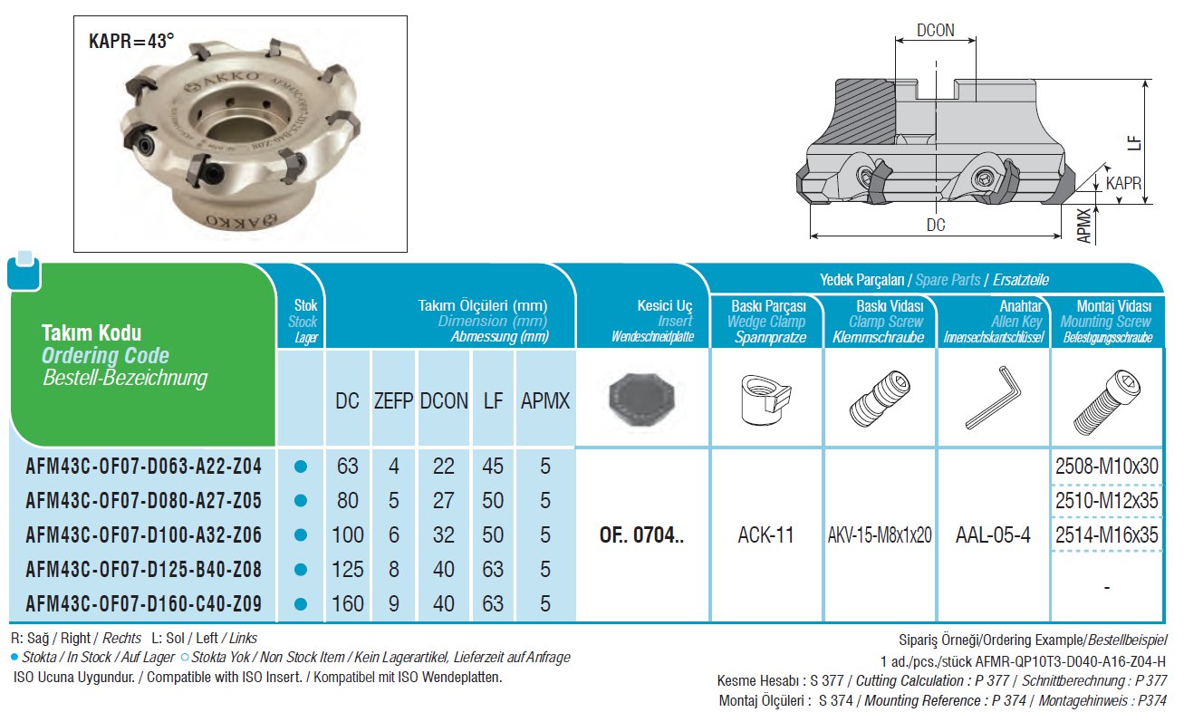 Fréza nástrčná čelní 43° AFM43C-OF07-D160-C40-Z09