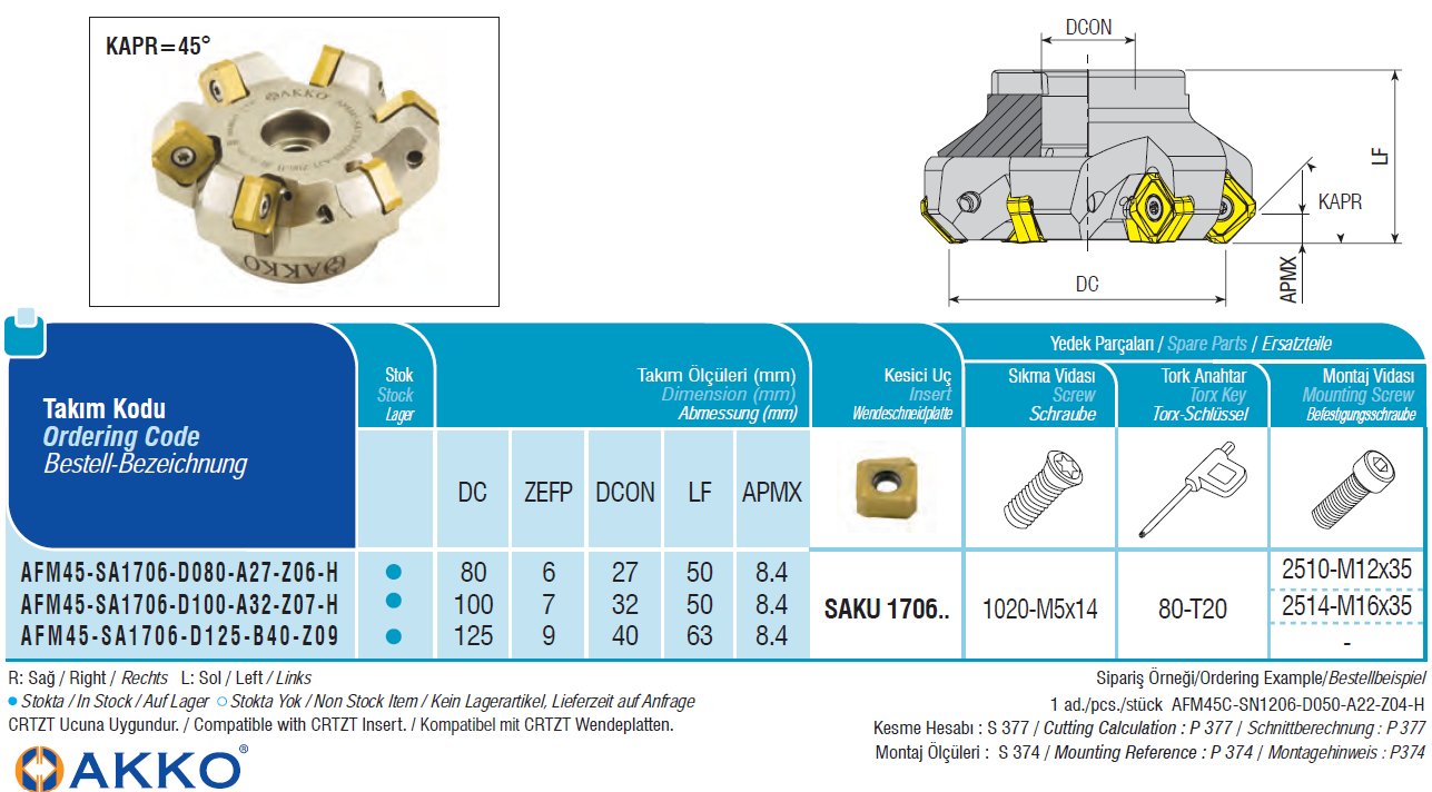 Fréza nástrčná čelní 45° AFM45-SA1706-D080-A27-Z06-H