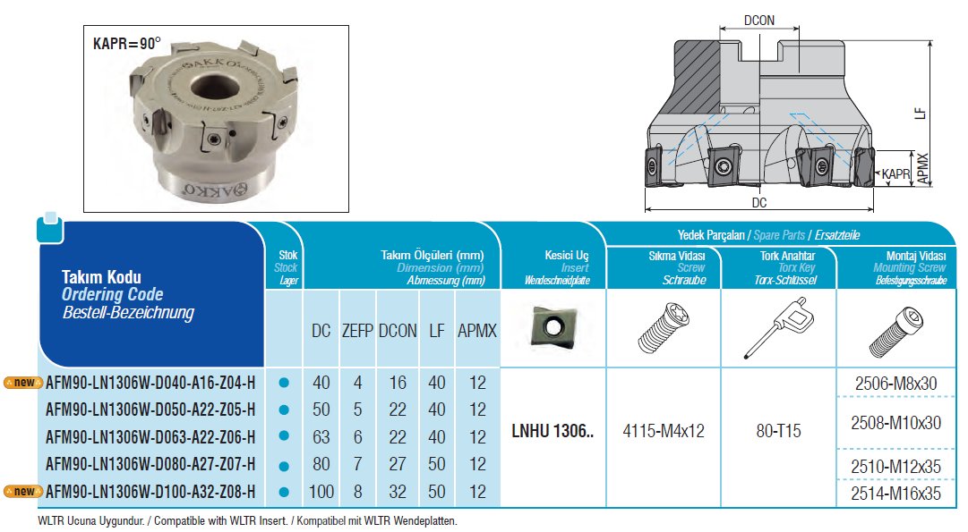 Fréza nástrčná čelní 90° AFM90-LN1306W-D080-A27-Z07-H