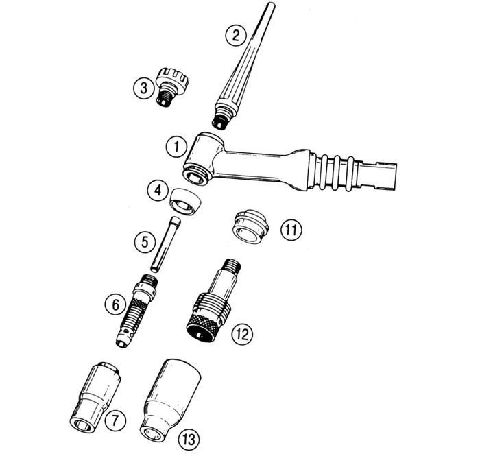 Plynem chlazený hořák s regulátorem. Zatížení 150 A (DC) 110 A (AC), ED 100%