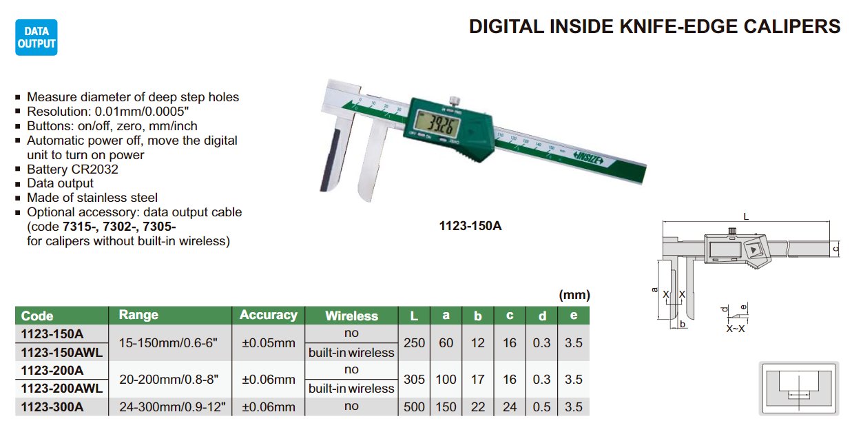 INSIZE 1123-150A digitální posuvné měřítko s čelistmi s nožovou hranou 15-150mm / 0,6-6\"