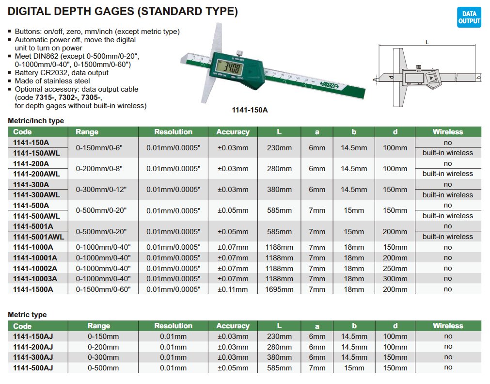 INSIZE 1141-300A Digitální hloubkoměr 0-300mm - 0,01mm/0,0005\"