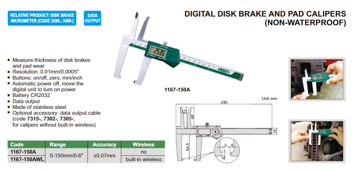 INSIZE 1167-150A digitání posuvné měřítko síly brzdových kotoučů