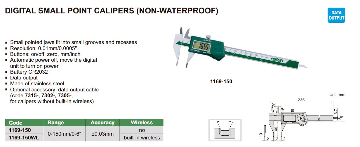 INSIZE 1169-150 digitální posuvné měřítko s tenkými čelistmi 0-150mm / 0,01mm