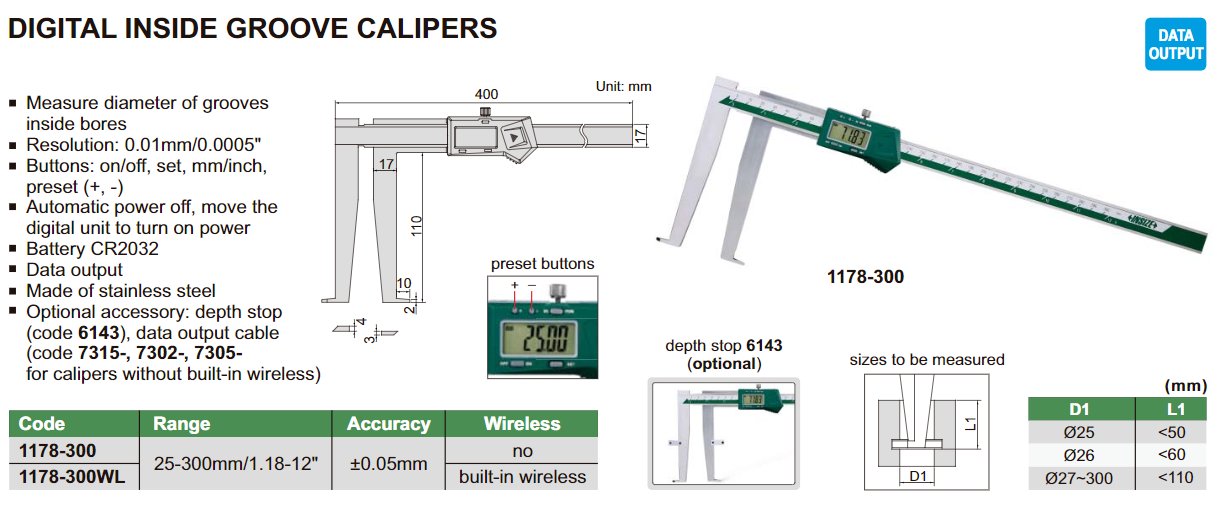 INSIZE 1178-300 digitální posuvné měřítko na vnitřní drážky 25-300mm / 0,01mm