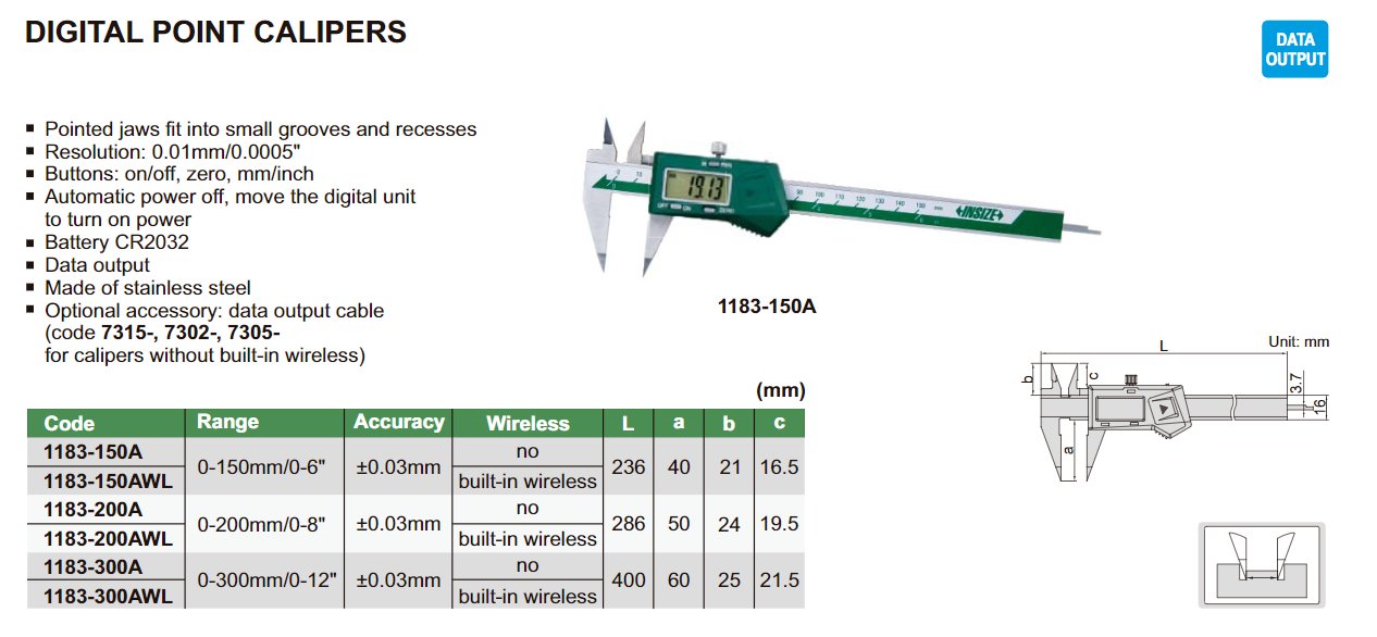 INSIZE 1183-150A digitální posuvné měřítko se špičatými čelistmi 0-150mm / 0,01mm