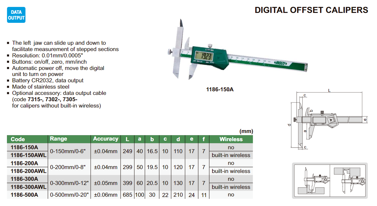 INSIZE 1186-300A digitální posuvné měřítko pro měření rozteče děr 0-300mm / 0,01mm