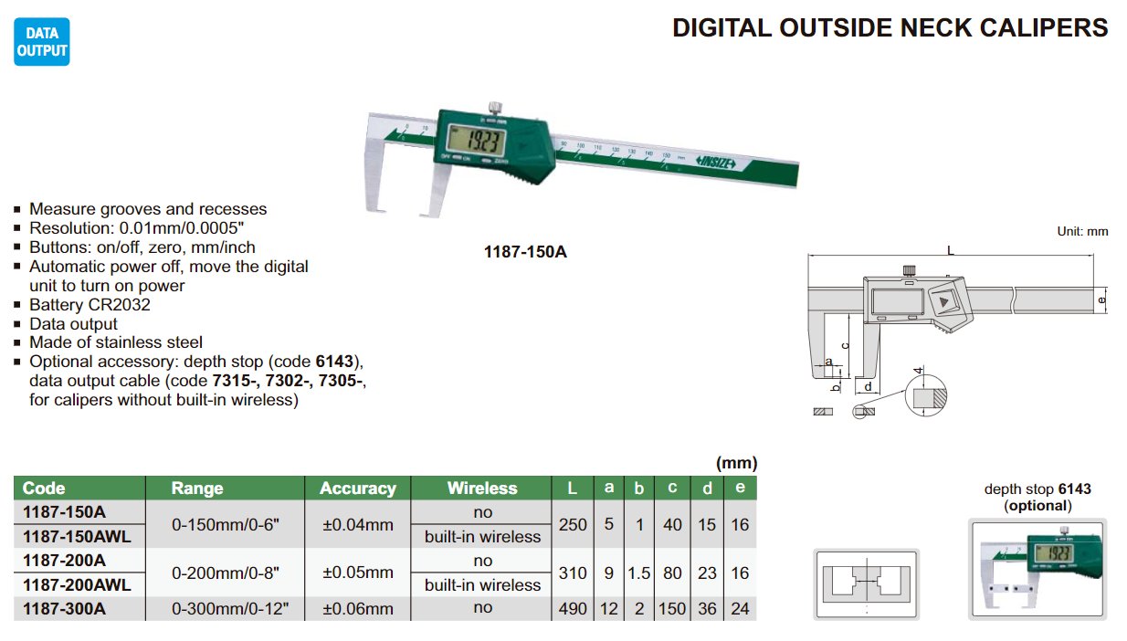 INSIZE 1187-150A digitální posuvné měřítko pro měření v drážkách 0-150mm / 0,01mm