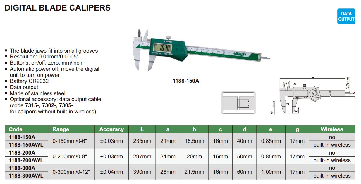 INSIZE 1188-150A digitální posuvné měřítko s čelistmi ve tvaru ostří 0-150mm / 0-6\"