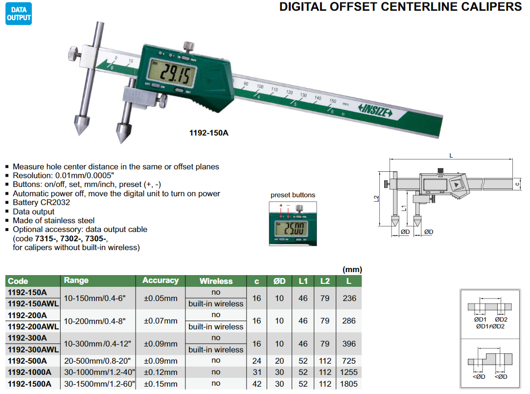 INSIZE 1192-500A digitální posuvné měřítko pro měření rozteče děr 20-500mm / 0,01mm