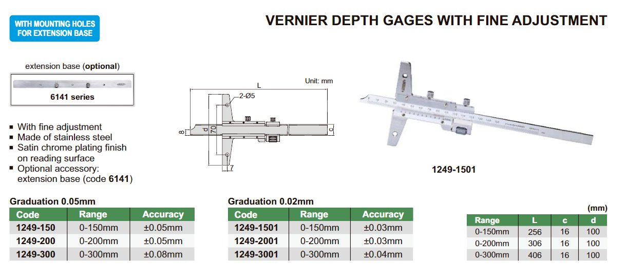INSIZE 1249-3001 analogový hloubkoměr s montážními otvory a jemným nastavováním