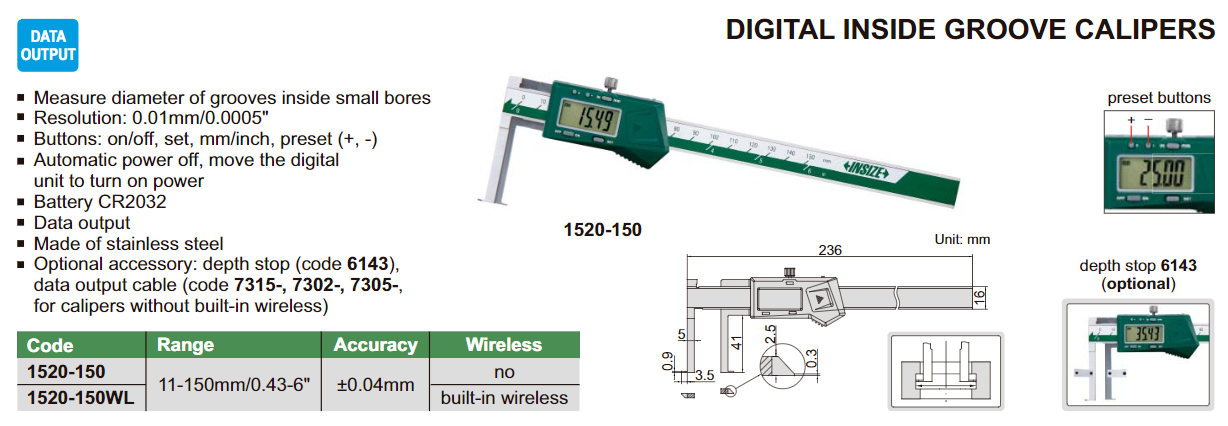 INSIZE 1520-150 digitální posuvné měřítko na vnitřní drážky 11-150mm / 0,01mm