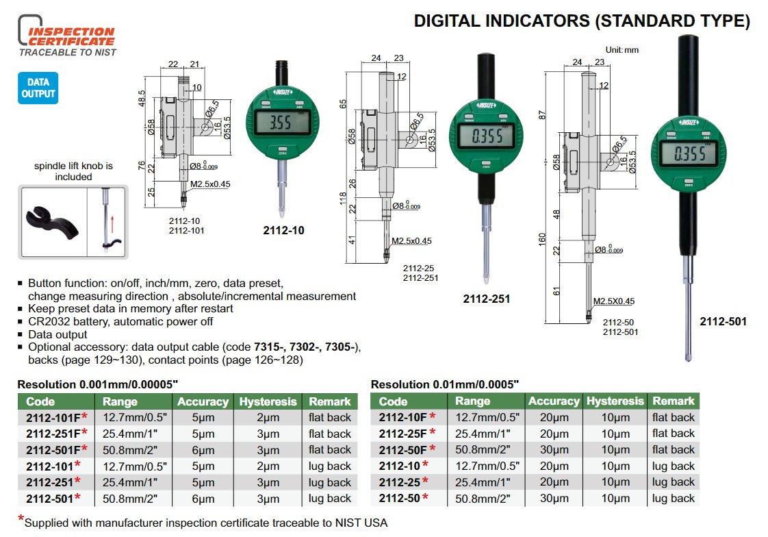 INSIZE 2112-50 Digitální úchylkoměr STANDARD 50,8mm/2" / 0,01 / 30µm ( s ouškem )