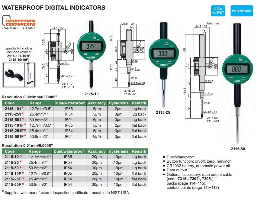 INSIZE 2115-50F digitální úchylkoměr IP54 VODĚODOLNÝ 50,8mm/2" / 0,01mm / 30um ( plochá záda )